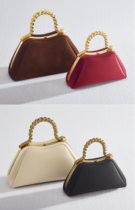 新款手提包的手柄轮廓经过重新设计,呈现出宛如灵蛇的S形曲线造型,同时巧妙融入了DESTREE品牌标志性的精致手工饰带元素。值得一提的是,饰带设计与宝格丽的历史传承紧密相连。二十世纪时,宝格丽便曾将精美的饰带用作缎带,与项链、吊坠相搭配。在此次推出的新品中,饰带的扭绳设计经过重新演绎,化身为灵动蜿蜒的金属曲线细节,并借助创新的电铸工艺实现了轻巧质感与考究设计的平衡。这一源自珠宝领域的精湛技艺,不仅彰显了宝格丽深厚的工艺底蕴,更创造出令人赞叹的反差美感:而熠熠生辉的金属材质却能展现出格外轻盈的质感。